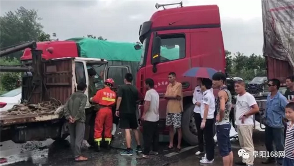 8月17日下午16时许,106国道太和县双浮镇加油站旁一辆大货车与小货车相撞,两车头部不同程度受损,小货车内一人被困。小货车上司机的妻子被困车中。消防员立即使用液压破拆工具将副驾驶一侧车门卸下,实施救