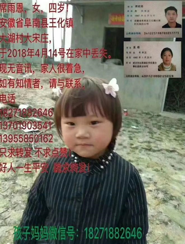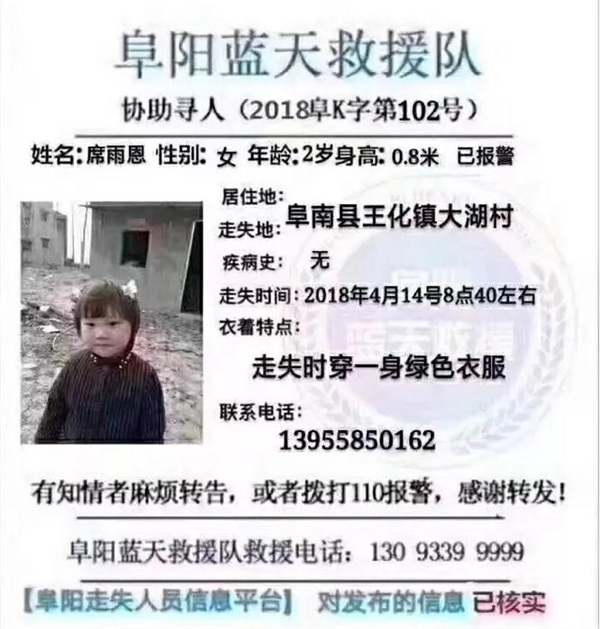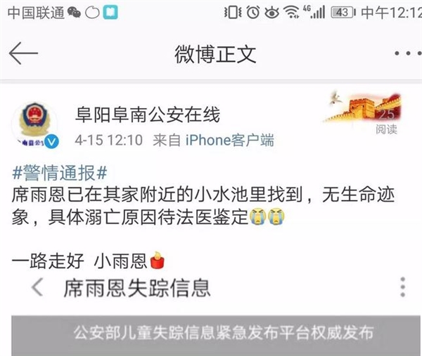 这两天阜阳人的朋友圈都被这条消息刷屏了在超过24个小时的苦苦寻找和等待之后,不幸的消息传来了,现在我们怀着沉痛的心情告诉大家,席雨恩在家附近的小水池里找到很不幸,已无生命迹象。具体死亡原因待法医鉴定希